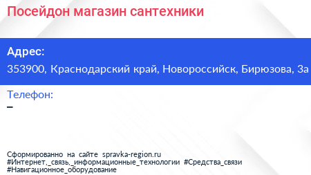 Посейдон, магазин сантехники по адресу 353900, Краснодарский край, Новороссийск, Бирюзова, 3а в дальнейшем Организация, размещена в следующих категориях: