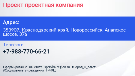Проект, проектная компания по адресу 353907, Краснодарский край, Новороссийск, Анапское шоссе, 37а в дальнейшем Организация, размещена в следующих категориях: