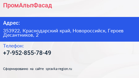 ПромАльпФасад по адресу 353922, Краснодарский край, Новороссийск, Героев Десантников, 2 в дальнейшем Организация, размещена в следующих категориях: