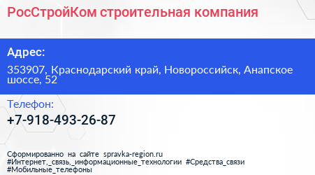 РосСтройКом, строительная компания по адресу 353907, Краснодарский край, Новороссийск, Анапское шоссе, 52 в дальнейшем Организация, размещена в следующих категориях: