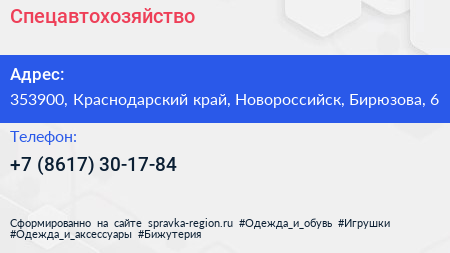 Спецавтохозяйство по адресу 353900, Краснодарский край, Новороссийск, Бирюзова, 6 в дальнейшем Организация, размещена в следующих категориях: