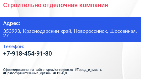 Строительно-отделочная компания по адресу 353993, Краснодарский край, Новороссийск, Шоссейная, 27 в дальнейшем Организация, размещена в следующих категориях: