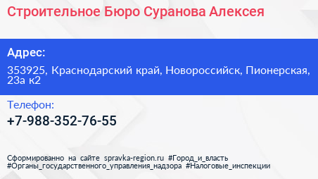 Строительное Бюро Суранова Алексея по адресу 353925, Краснодарский край, Новороссийск, Пионерская, 23а к2 в дальнейшем Организация, размещена в следующих категориях: