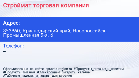 Строймат, торговая компания по адресу 353960, Краснодарский край, Новороссийск, Промышленная 5-я, 6 в дальнейшем Организация, размещена в следующих категориях: