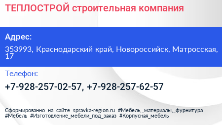 ТЕПЛОСТРОЙ, строительная компания по адресу 353993, Краснодарский край, Новороссийск, Матросская, 17 в дальнейшем Организация, размещена в следующих категориях: