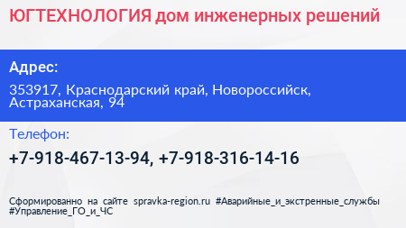 ЮГТЕХНОЛОГИЯ, дом инженерных решений по адресу 353917, Краснодарский край, Новороссийск, Астраханская, 94 в дальнейшем Организация, размещена в следующих категориях: