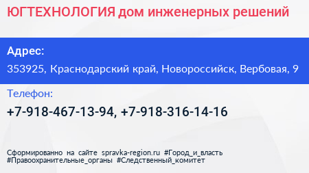ЮГТЕХНОЛОГИЯ, дом инженерных решений по адресу 353925, Краснодарский край, Новороссийск, Вербовая, 9 в дальнейшем Организация, размещена в следующих категориях: