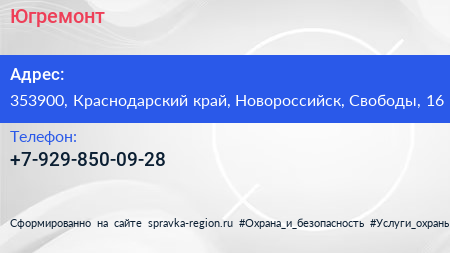 Югремонт по адресу 353900, Краснодарский край, Новороссийск, Свободы, 16 в дальнейшем Организация, размещена в следующих категориях: