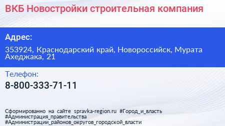 ВКБ-Новостройки, строительная компания по адресу 353924, Краснодарский край, Новороссийск, Мурата Ахеджака, 21 в дальнейшем Организация, размещена в следующих категориях: