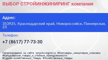 ВЫБОР-СТРОЙИНЖИНИРИНГ, компания по адресу 353925, Краснодарский край, Новороссийск, Пионерская, 23 в дальнейшем Организация, размещена в следующих категориях: