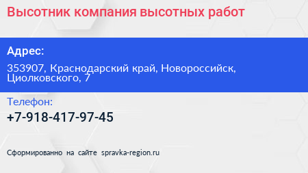 Высотник, компания высотных работ по адресу 353907, Краснодарский край, Новороссийск, Циолковского, 7 в дальнейшем Организация, размещена в следующих категориях: