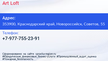 Art-Loft по адресу 353900, Краснодарский край, Новороссийск, Советов, 55 в дальнейшем Организация, размещена в следующих категориях: