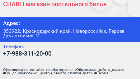 CHARLI, магазин постельного белья по адресу 353922, Краснодарский край, Новороссийск, Героев Десантников, 2 в дальнейшем Организация, размещена в следующих категориях:
