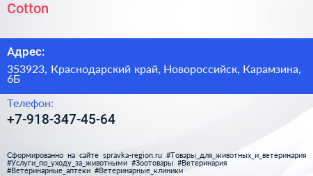Cotton по адресу 353923, Краснодарский край, Новороссийск, Карамзина, 6Б в дальнейшем Организация, размещена в следующих категориях: