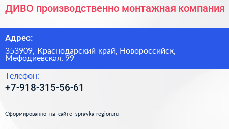 ДИВО, производственно-монтажная компания по адресу 353909, Краснодарский край, Новороссийск, Мефодиевская, 99 в дальнейшем Организация, размещена в следующих категориях: