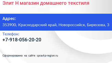 Элит-Н, магазин домашнего текстиля по адресу 353900, Краснодарский край, Новороссийск, Бирюзова, 3 в дальнейшем Организация, размещена в следующих категориях: