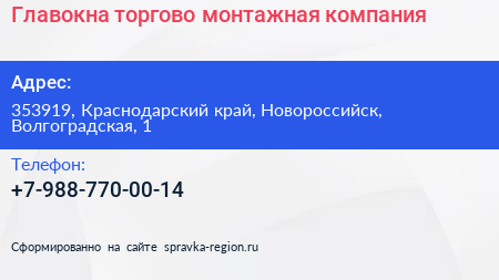 Главокна, торгово-монтажная компания по адресу 353919, Краснодарский край, Новороссийск, Волгоградская, 1 в дальнейшем Организация, размещена в следующих категориях: