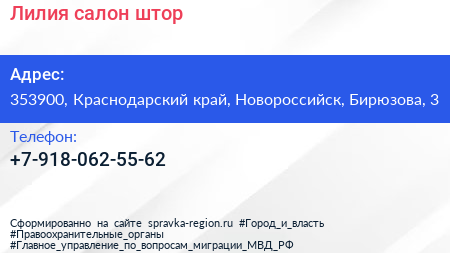 Лилия, салон штор по адресу 353900, Краснодарский край, Новороссийск, Бирюзова, 3 в дальнейшем Организация, размещена в следующих категориях: