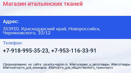 Магазин итальянских тканей по адресу 353910, Краснодарский край, Новороссийск, Черняховского, 10/12 в дальнейшем Организация, размещена в следующих категориях:
