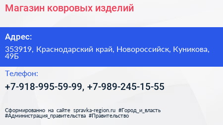 Магазин ковровых изделий по адресу 353919, Краснодарский край, Новороссийск, Куникова, 49Б в дальнейшем Организация, размещена в следующих категориях: