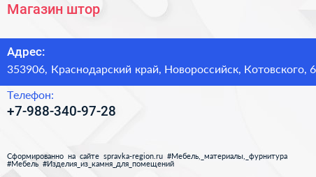 Магазин штор по адресу 353906, Краснодарский край, Новороссийск, Котовского, 6 в дальнейшем Организация, размещена в следующих категориях: