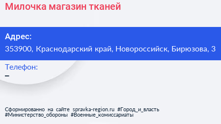 Милочка, магазин тканей по адресу 353900, Краснодарский край, Новороссийск, Бирюзова, 3 в дальнейшем Организация, размещена в следующих категориях: