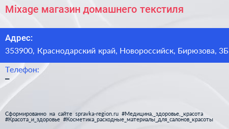 Mixage, магазин домашнего текстиля по адресу 353900, Краснодарский край, Новороссийск, Бирюзова, 3Б в дальнейшем Организация, размещена в следующих категориях: