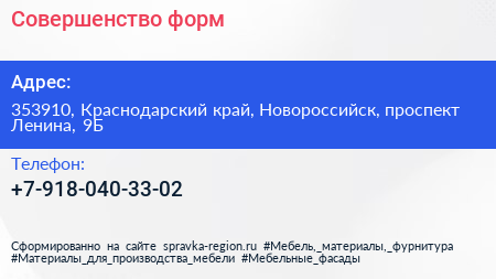 Совершенство форм по адресу 353910, Краснодарский край, Новороссийск, проспект Ленина, 9Б в дальнейшем Организация, размещена в следующих категориях: