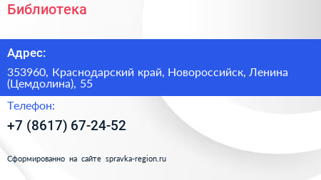 Библиотека по адресу 353960, Краснодарский край, Новороссийск, Ленина (Цемдолина), 55 в дальнейшем Организация, размещена в следующих категориях: