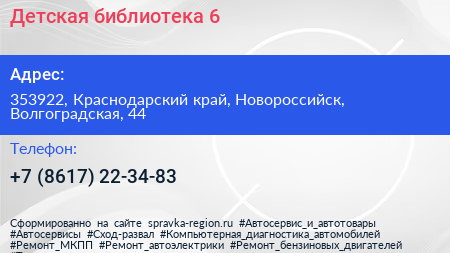 Детская библиотека №6 по адресу 353922, Краснодарский край, Новороссийск, Волгоградская, 44 в дальнейшем Организация, размещена в следующих категориях:
