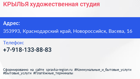 КРЫЛЬЯ, художественная студия по адресу 353993, Краснодарский край, Новороссийск, Васева, 16 в дальнейшем Организация, размещена в следующих категориях: