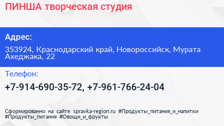 ПИНША, творческая студия по адресу 353924, Краснодарский край, Новороссийск, Мурата Ахеджака, 22 в дальнейшем Организация, размещена в следующих категориях: