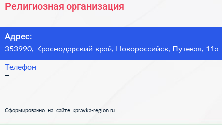 Религиозная организация по адресу 353990, Краснодарский край, Новороссийск, Путевая, 11а в дальнейшем Организация, размещена в следующих категориях: