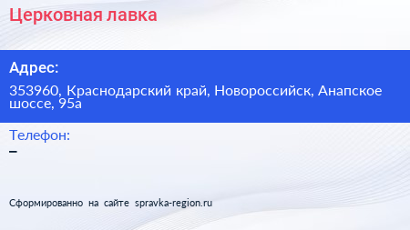Церковная лавка по адресу 353960, Краснодарский край, Новороссийск, Анапское шоссе, 95а в дальнейшем Организация, размещена в следующих категориях: