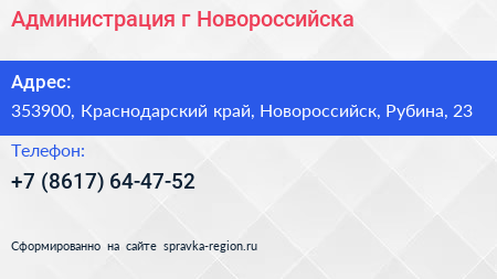 Администрация г. Новороссийска по адресу 353900, Краснодарский край, Новороссийск, Рубина, 23 в дальнейшем Организация, размещена в следующих категориях: