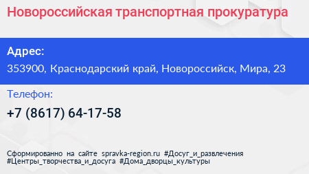 Новороссийская транспортная прокуратура по адресу 353900, Краснодарский край, Новороссийск, Мира, 23 в дальнейшем Организация, размещена в следующих категориях:
