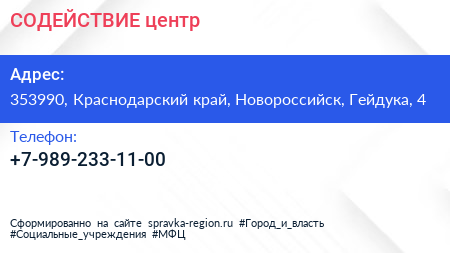 СОДЕЙСТВИЕ, центр по адресу 353990, Краснодарский край, Новороссийск, Гейдука, 4 в дальнейшем Организация, размещена в следующих категориях:
