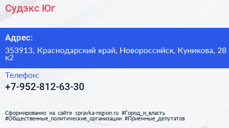 Судэкс-Юг по адресу 353913, Краснодарский край, Новороссийск, Куникова, 28 к2 в дальнейшем Организация, размещена в следующих категориях: