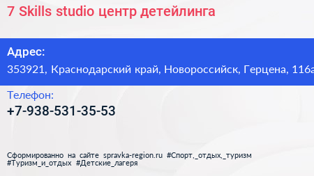 7 Skills studio, центр детейлинга по адресу 353921, Краснодарский край, Новороссийск, Герцена, 116а в дальнейшем Организация, размещена в следующих категориях: