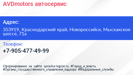AVDmotors, автосервис по адресу 353919, Краснодарский край, Новороссийск, Мысхакское шоссе, 71а в дальнейшем Организация, размещена в следующих категориях: