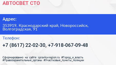 АВТОСВЕТ, СТО по адресу 353919, Краснодарский край, Новороссийск, Волгоградская, 91 в дальнейшем Организация, размещена в следующих категориях: