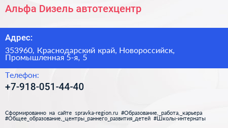 Альфа Dизель, автотехцентр по адресу 353960, Краснодарский край, Новороссийск, Промышленная 5-я, 5 в дальнейшем Организация, размещена в следующих категориях: