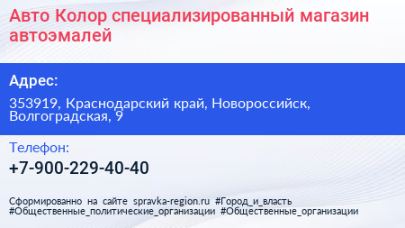 Авто Колор, специализированный магазин автоэмалей по адресу 353919, Краснодарский край, Новороссийск, Волгоградская, 9 в дальнейшем Организация, размещена в следующих категориях: