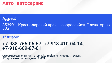 Авто+, автосервис по адресу 353901, Краснодарский край, Новороссийск, Элеваторная, 33а в дальнейшем Организация, размещена в следующих категориях:
