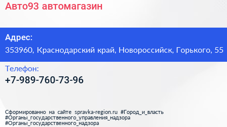 Авто93, автомагазин по адресу 353960, Краснодарский край, Новороссийск, Горького, 55 в дальнейшем Организация, размещена в следующих категориях: