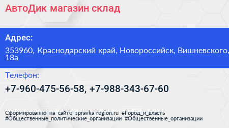 АвтоДик, магазин-склад по адресу 353960, Краснодарский край, Новороссийск, Вишневского, 18а в дальнейшем Организация, размещена в следующих категориях: