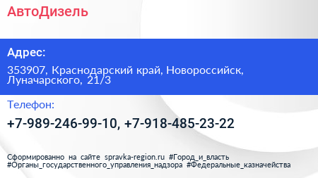 АвтоДизель по адресу 353907, Краснодарский край, Новороссийск, Луначарского, 21/3 в дальнейшем Организация, размещена в следующих категориях:
