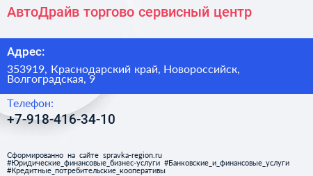 АвтоДрайв, торгово-сервисный центр по адресу 353919, Краснодарский край, Новороссийск, Волгоградская, 9 в дальнейшем Организация, размещена в следующих категориях: