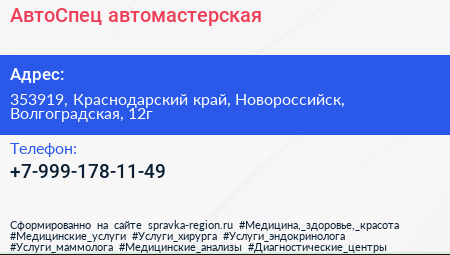 АвтоСпец, автомастерская по адресу 353919, Краснодарский край, Новороссийск, Волгоградская, 12г в дальнейшем Организация, размещена в следующих категориях: