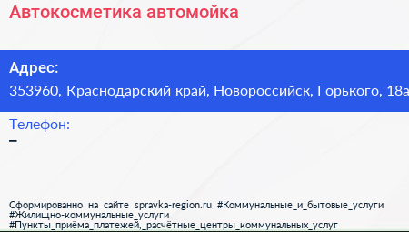 Автокосметика, автомойка по адресу 353960, Краснодарский край, Новороссийск, Горького, 18а в дальнейшем Организация, размещена в следующих категориях: